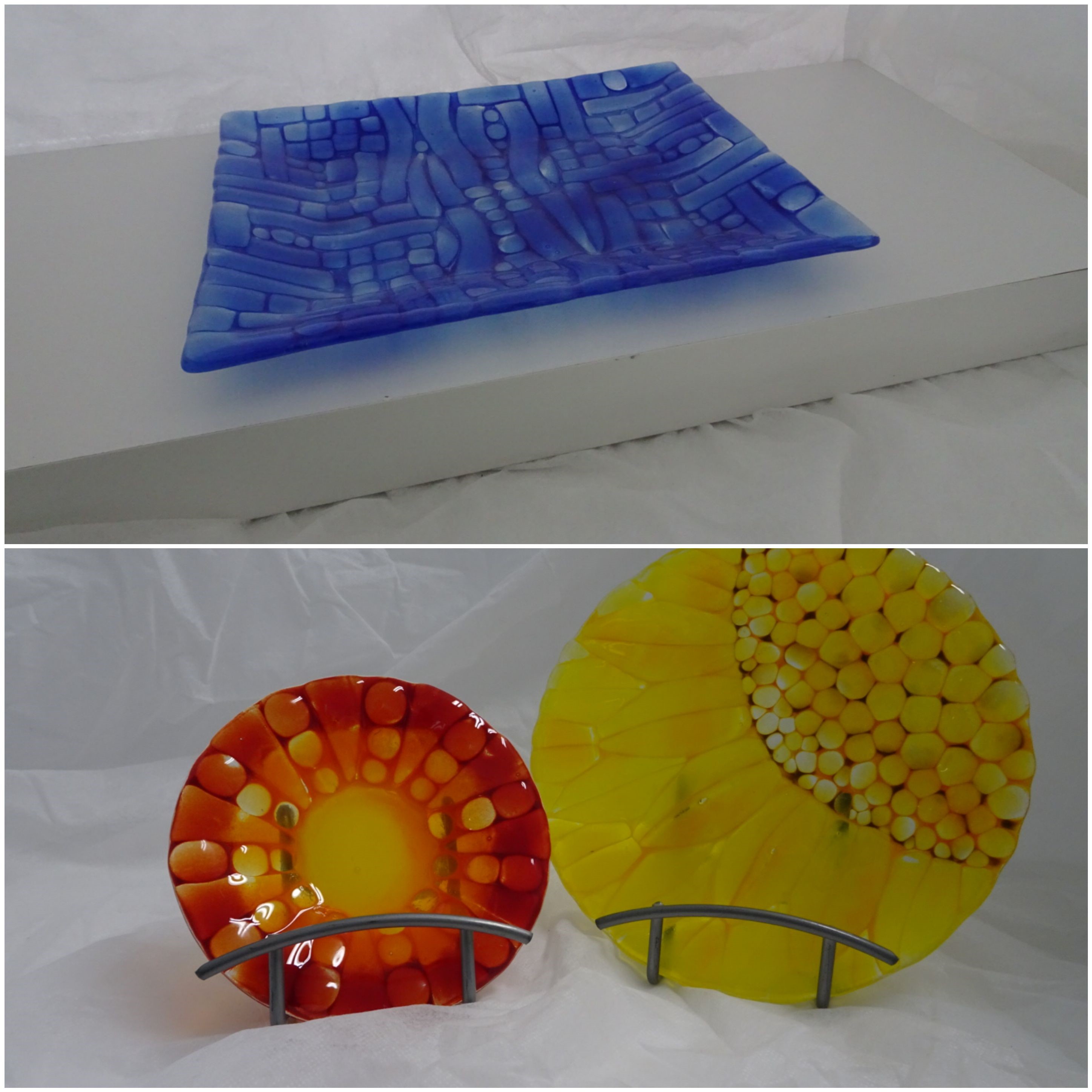 and/or small pieces of glass on a glass base to create a unique design. Fuse to a flat or textured surface and can be slumped if desired.